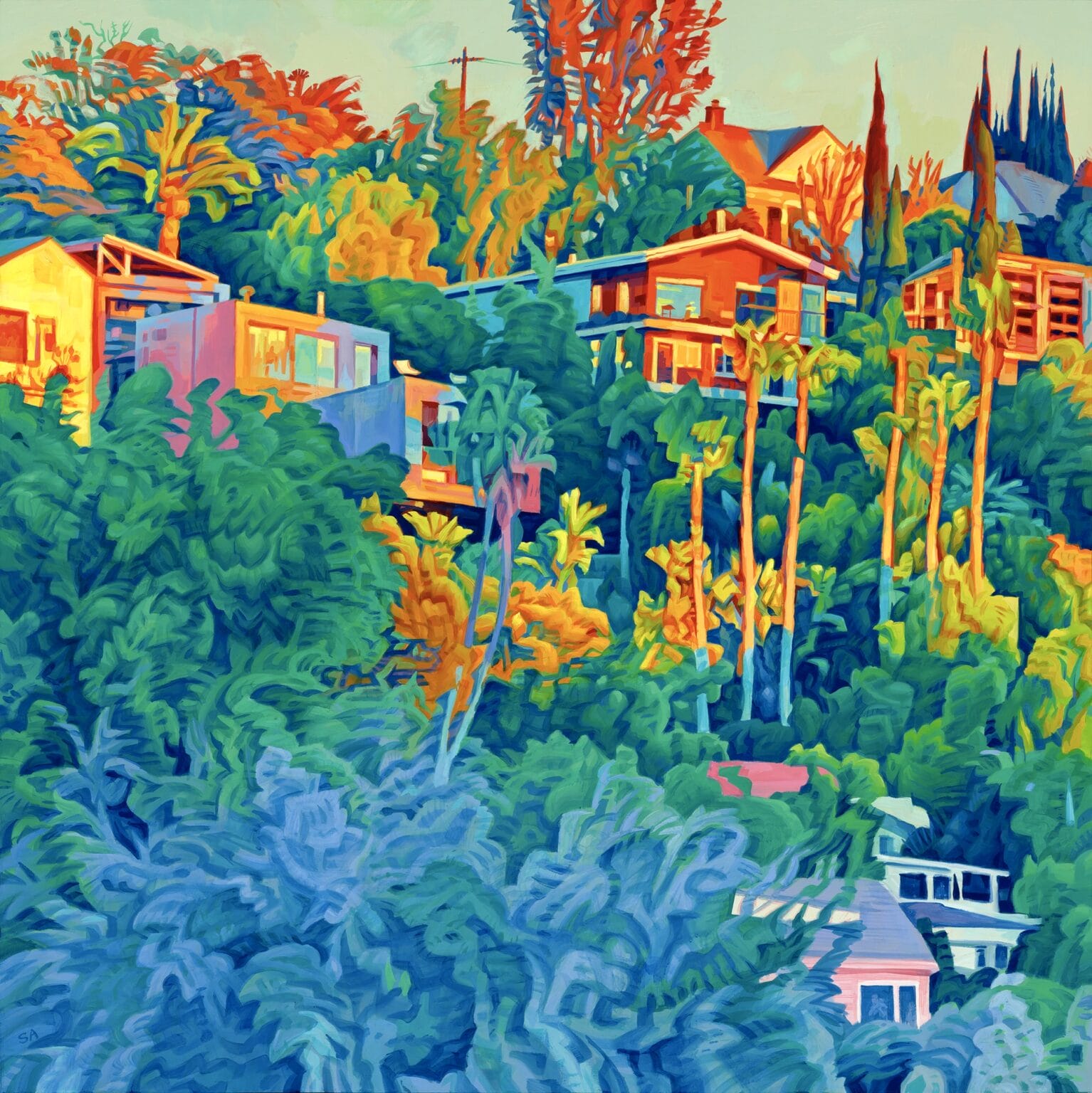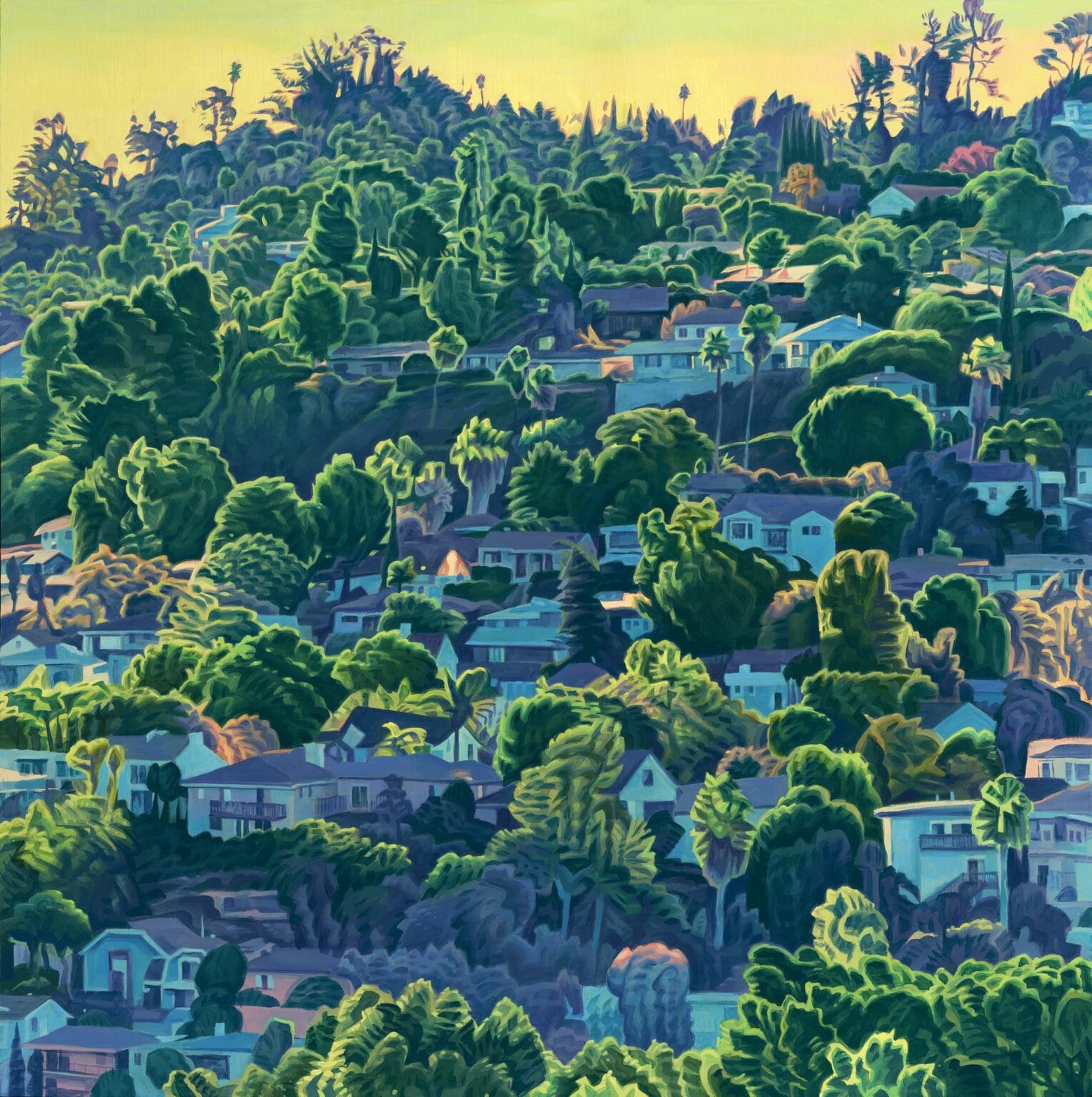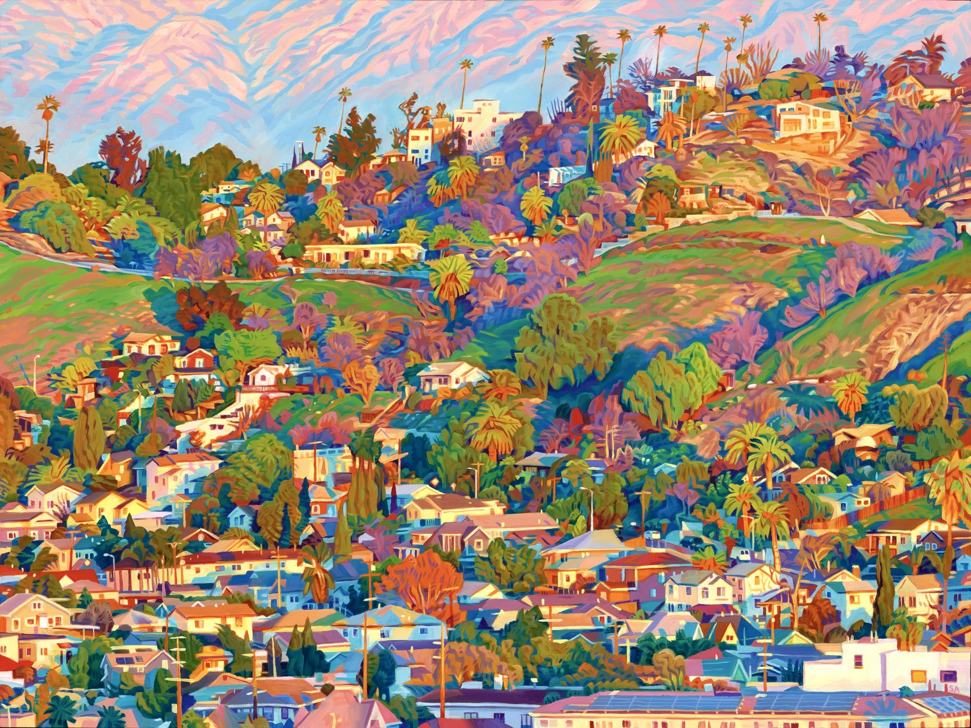 Capturando el brillo mágico de la hora dorada, el azul profundo del atardecer temprano y el amarillo mantequilla de la mañana, Seth Armstrong nos transporta al sur de California en su serie continua de pinturas al óleo. Bungalows brillantes, cables eléctricos, palmeras y arbustos salpican las colinas que dan forma a Los Ángeles, con las montañas de San Gabriel alzándose a menudo al fondo.