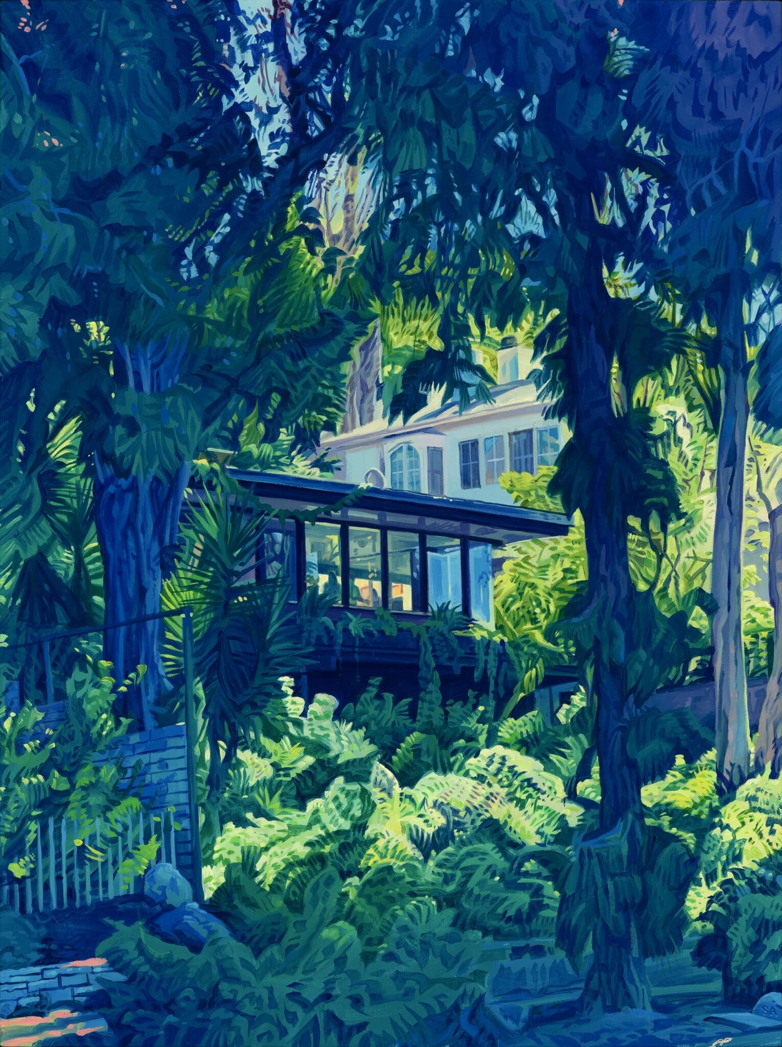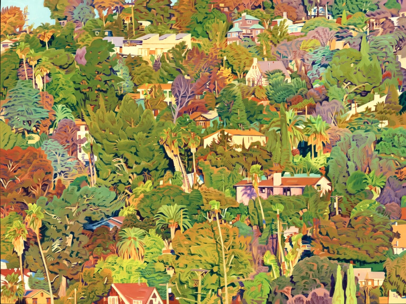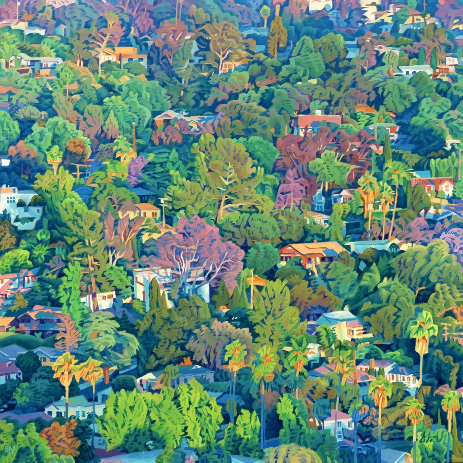La vegetación juega un papel central en los retratos suburbanos de Armstrong, revelando y ocultando caminos, casas e infraestructura, evocando la reputación de la ciudad como un lugar donde cualquier sueño parece posible. Sin embargo, sus vecindarios en expansión, la inmensa riqueza y su rol como núcleo de la industria del entretenimiento tienden a oscurecer las corrientes subterráneas que han salido a la luz con protestas recientes por la inmigración o los incendios devastadores del año pasado.