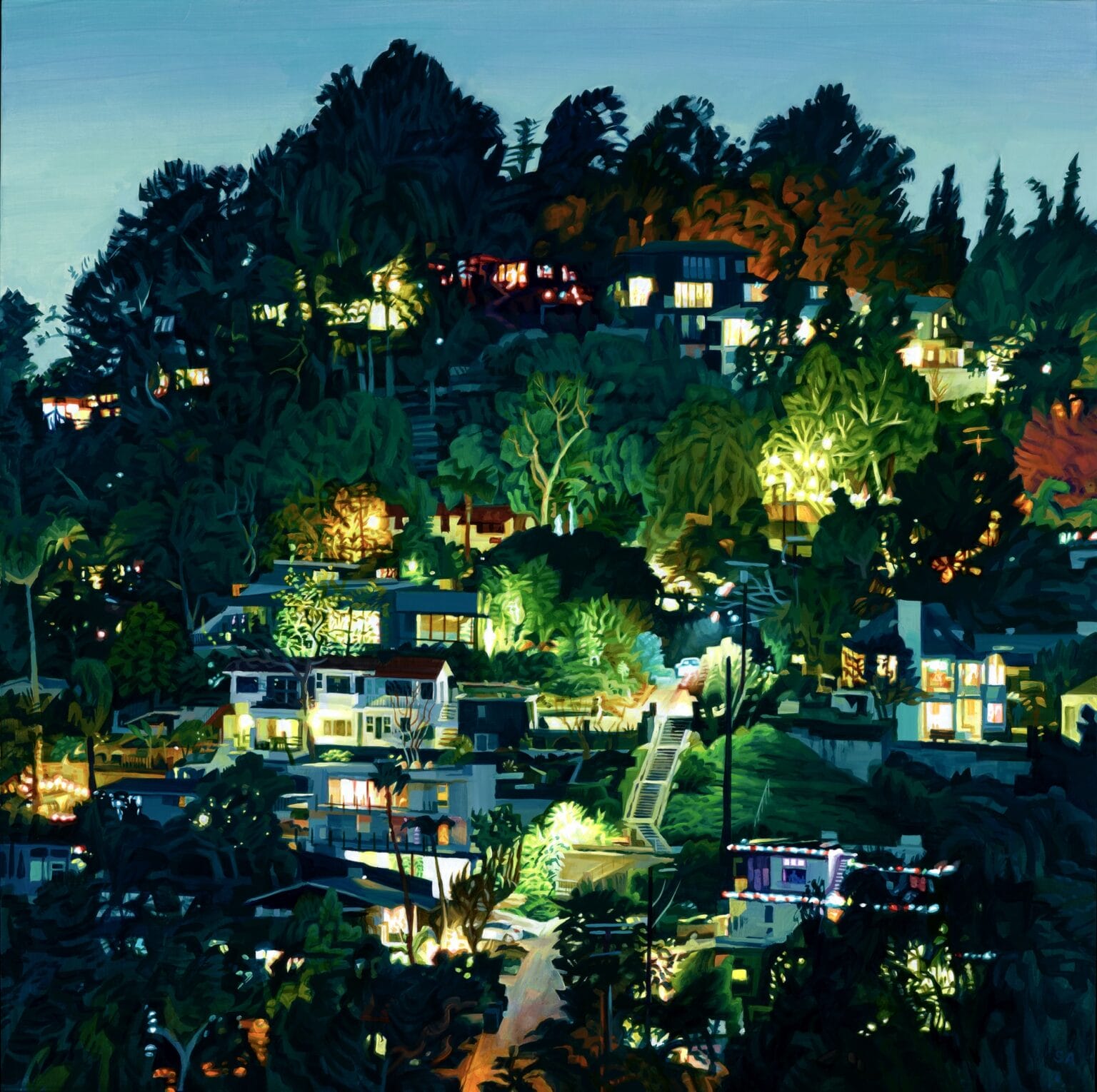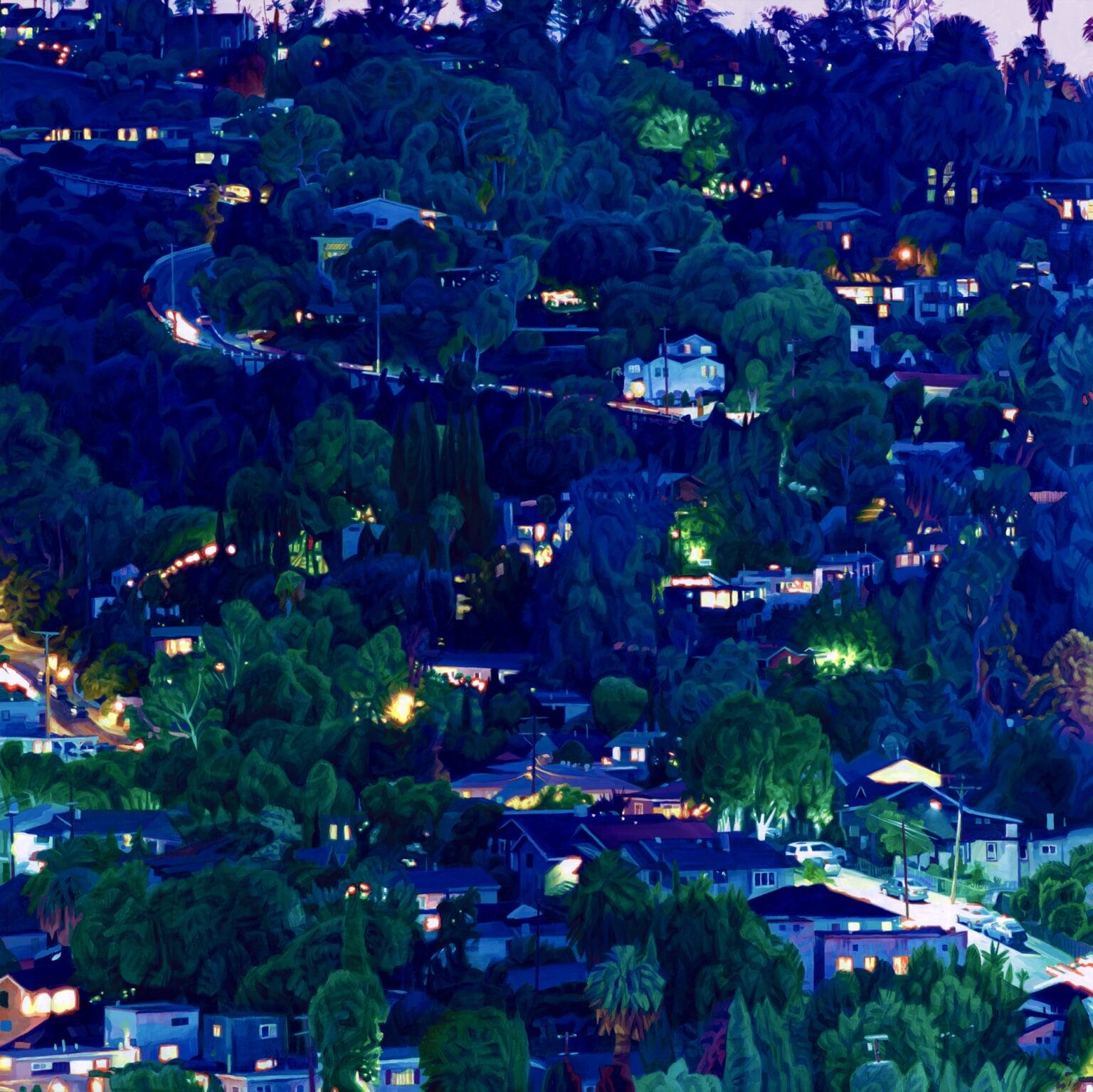 Vistos desde la distancia, los vecindarios en las colinas parecen idílicos, incluso paradisíacos, pero insinúa elementos fuera de cuadro en esta ciudad en constante cambio: tensiones sociopolíticas latentes, montañas quemadas y casas arrasadas por incendios, y disparidades económicas palpables. A veces hay personas presentes, medio ocultas en ventanas y muchas veces solo visibles al observar de cerca. “Hay sustancia detrás de las formas”, dice Armstrong. “A veces puedes echar un vistazo hacia adentro. A veces no”.