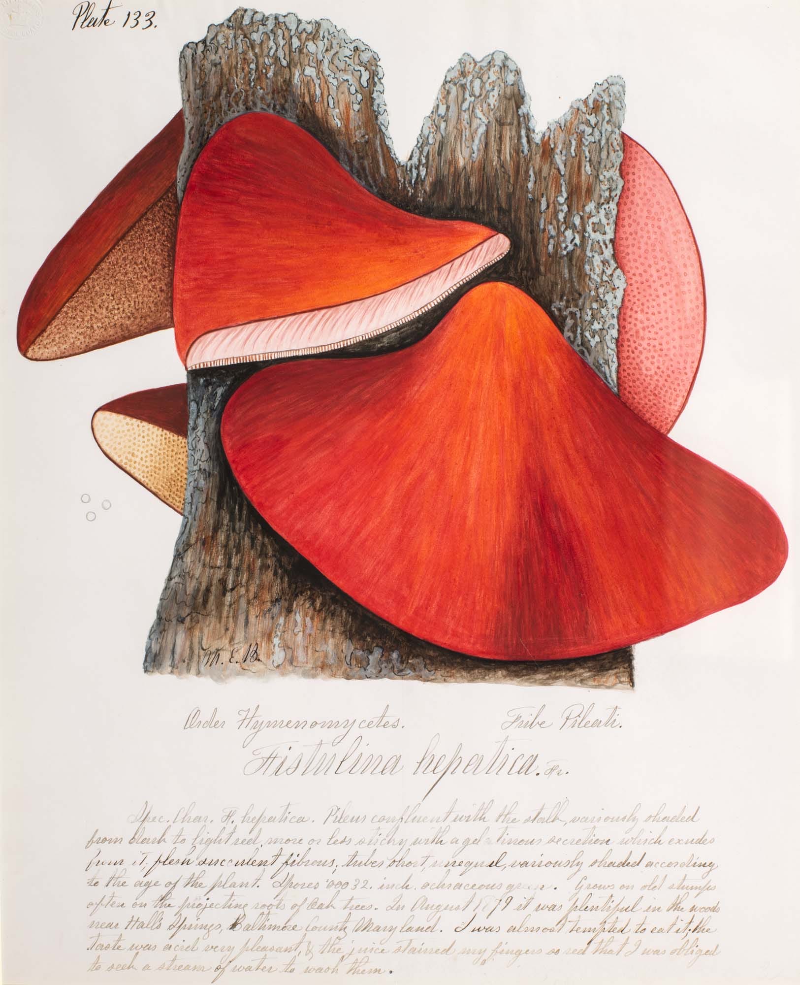 La muestra incluye 28 acuarelas originales y registros detallados que forman parte del manuscrito inédito de su libro The Fungi of Maryland, donde Banning documentó 175 especies, de las cuales 23 eran desconocidas hasta entonces. Una de sus ilustraciones más reconocidas es Fistulina hepatica (finales de 1800), pintada en acuarela sobre papel.