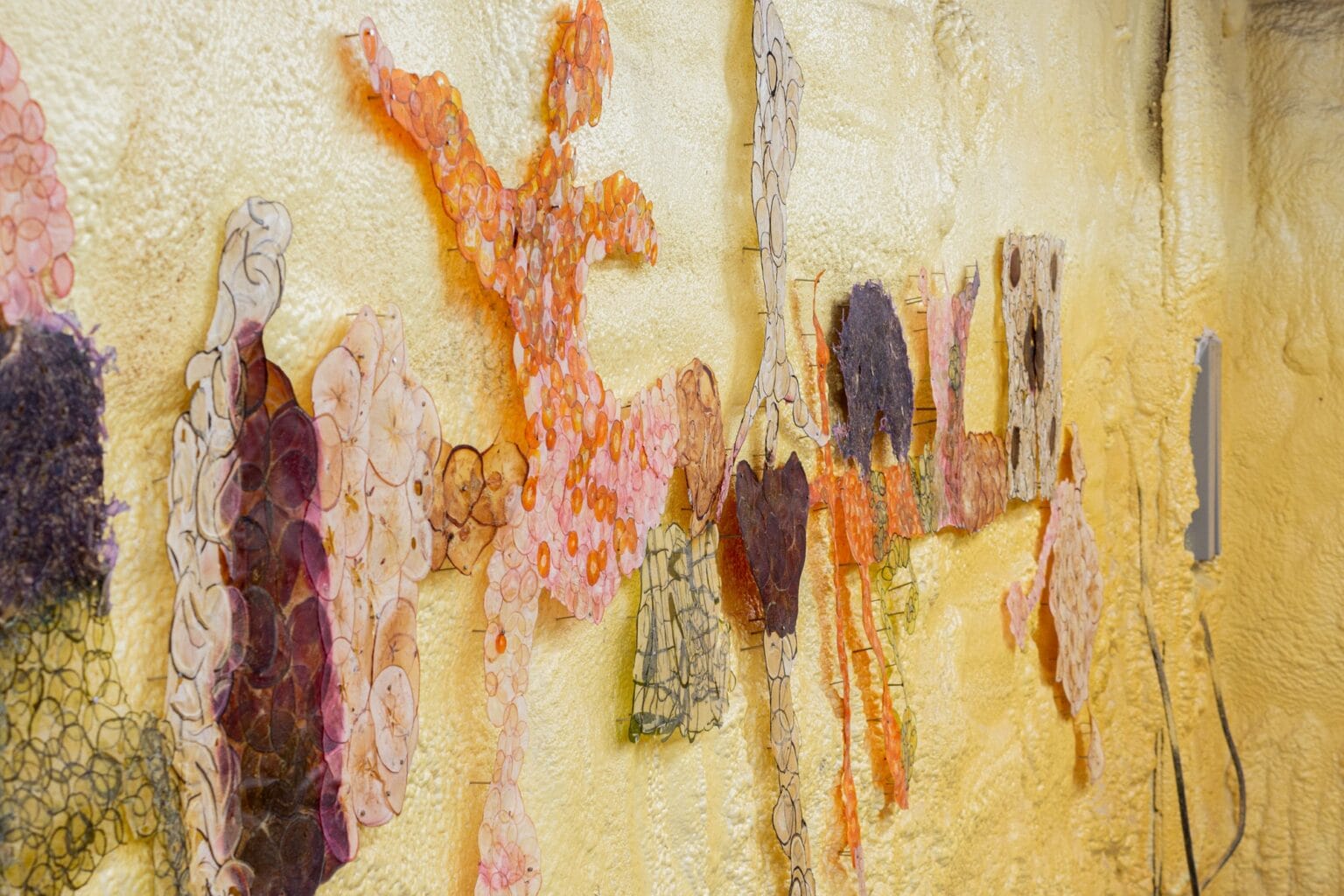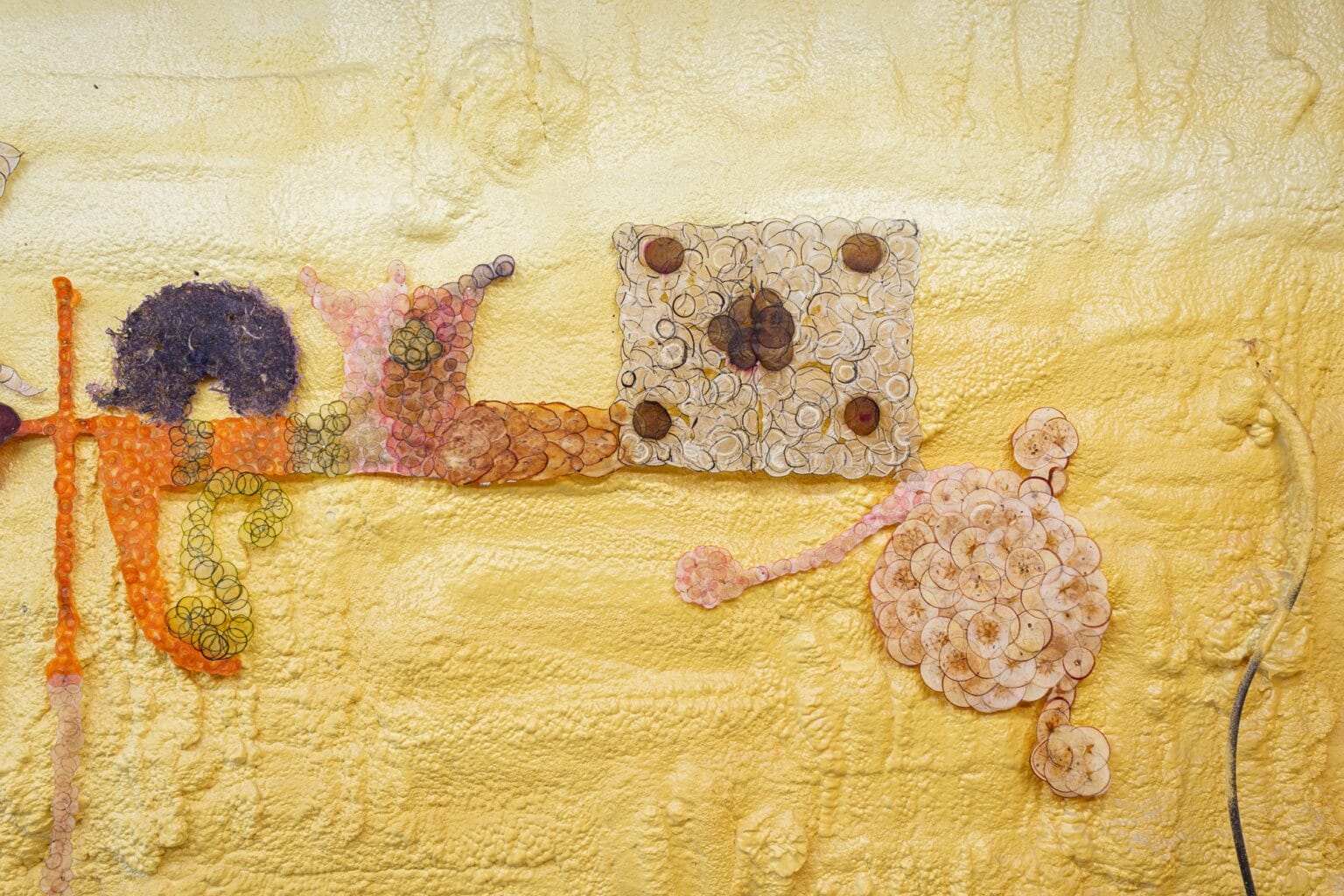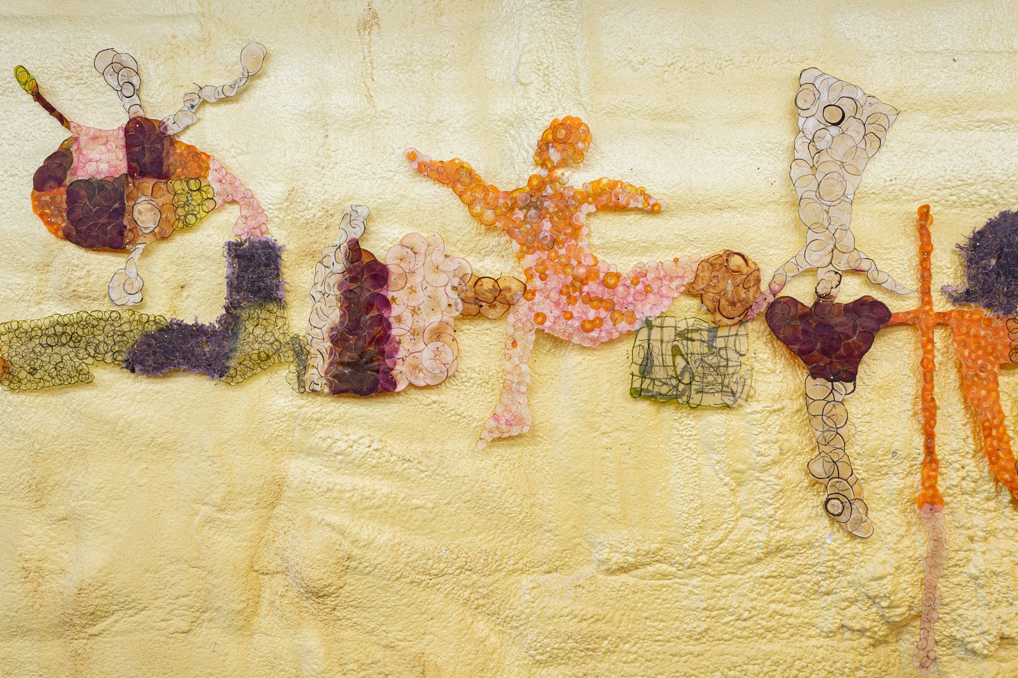 En su más reciente exposición individual, Picker en Chatham Soccer, presentó una serie de estas obras. En una de las paredes, un grupo de bailarines parece danzar alegremente, mientras que en otra aparecen formas más abstractas organizadas en degradados. Con paredes de espuma amarilla y paneles de madera, el espacio poco convencional evoca una bodega de frutas lista para guardar la cosecha durante el invierno, una atmósfera perfecta para este material tan poco común.