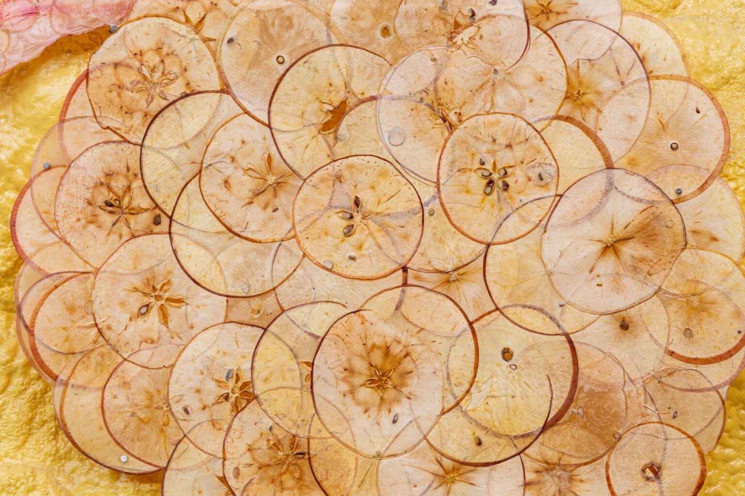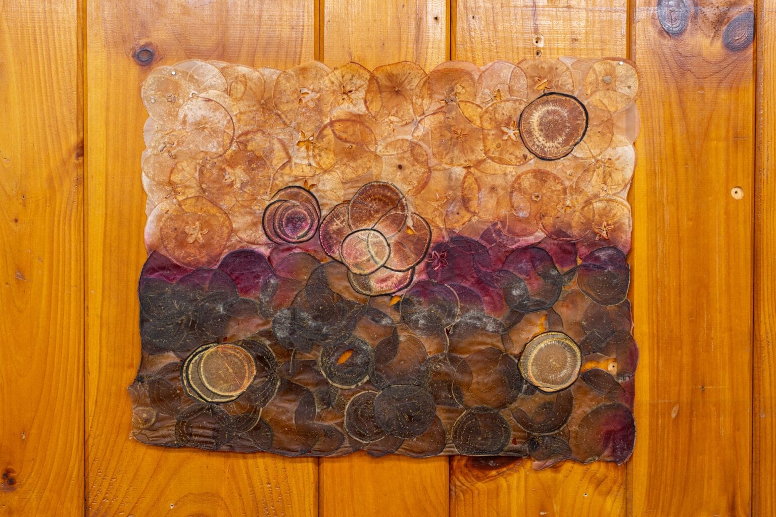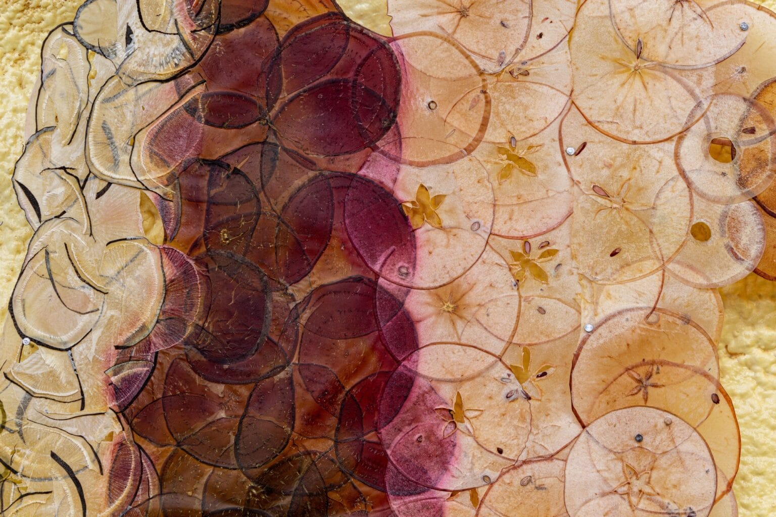 Al igual que las tradiciones ancestrales de tejer papiro, Ruby Jackson crea un sustrato igualmente seco a partir de delicados cortes de frutas y verduras. La artista, radicada en Chatham, Nueva York, corta y deshidrata ingredientes que van desde manzanas y peras hasta daikon morado y sandía, transformándolos en piezas delgadas y translúcidas que luego utiliza para armar collages en distintas formas.