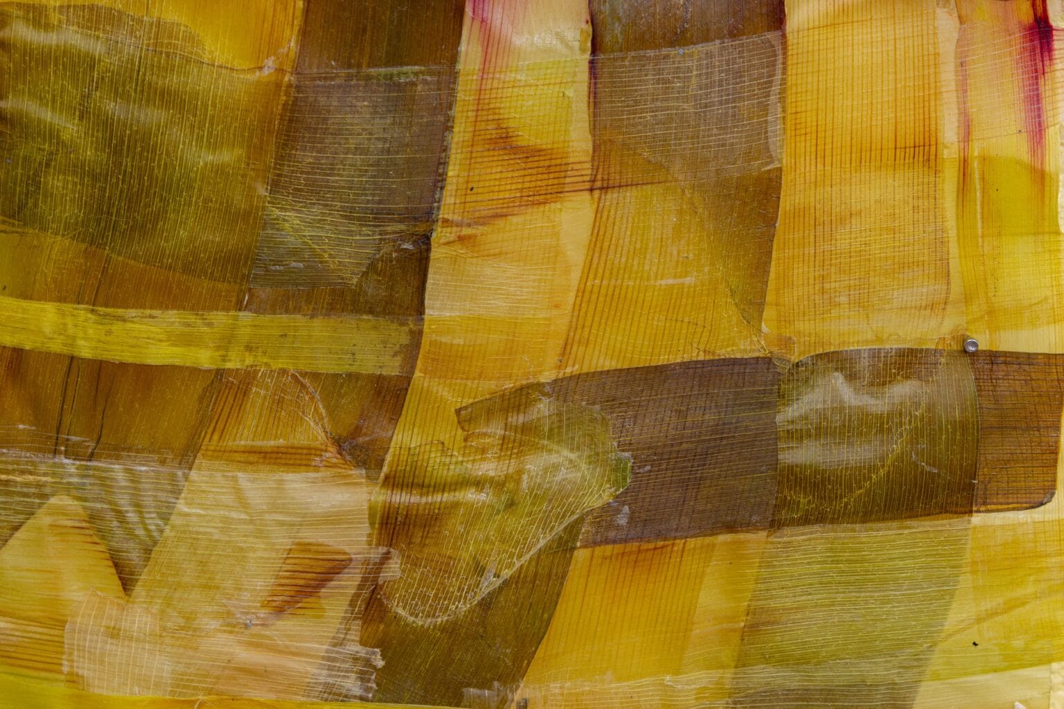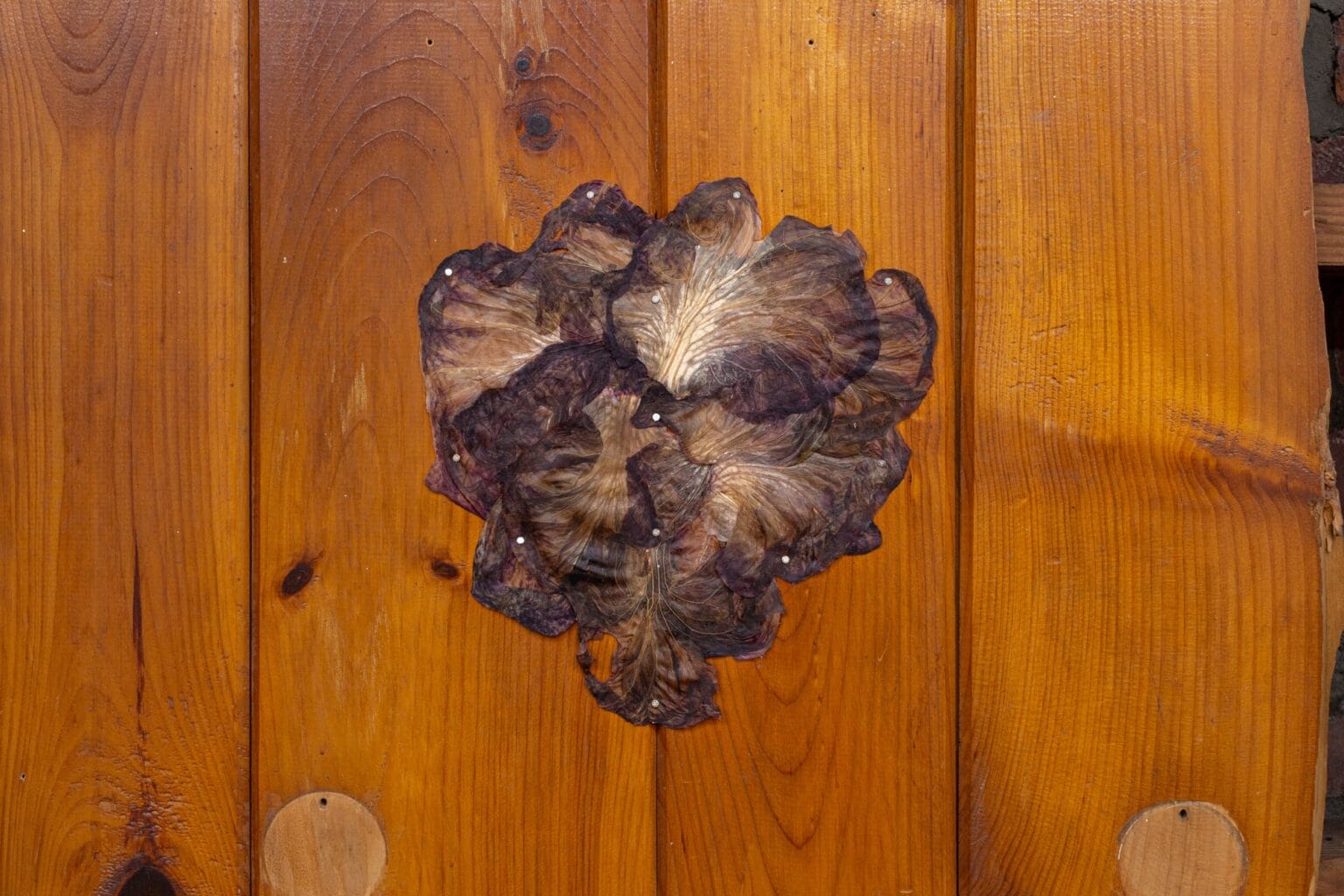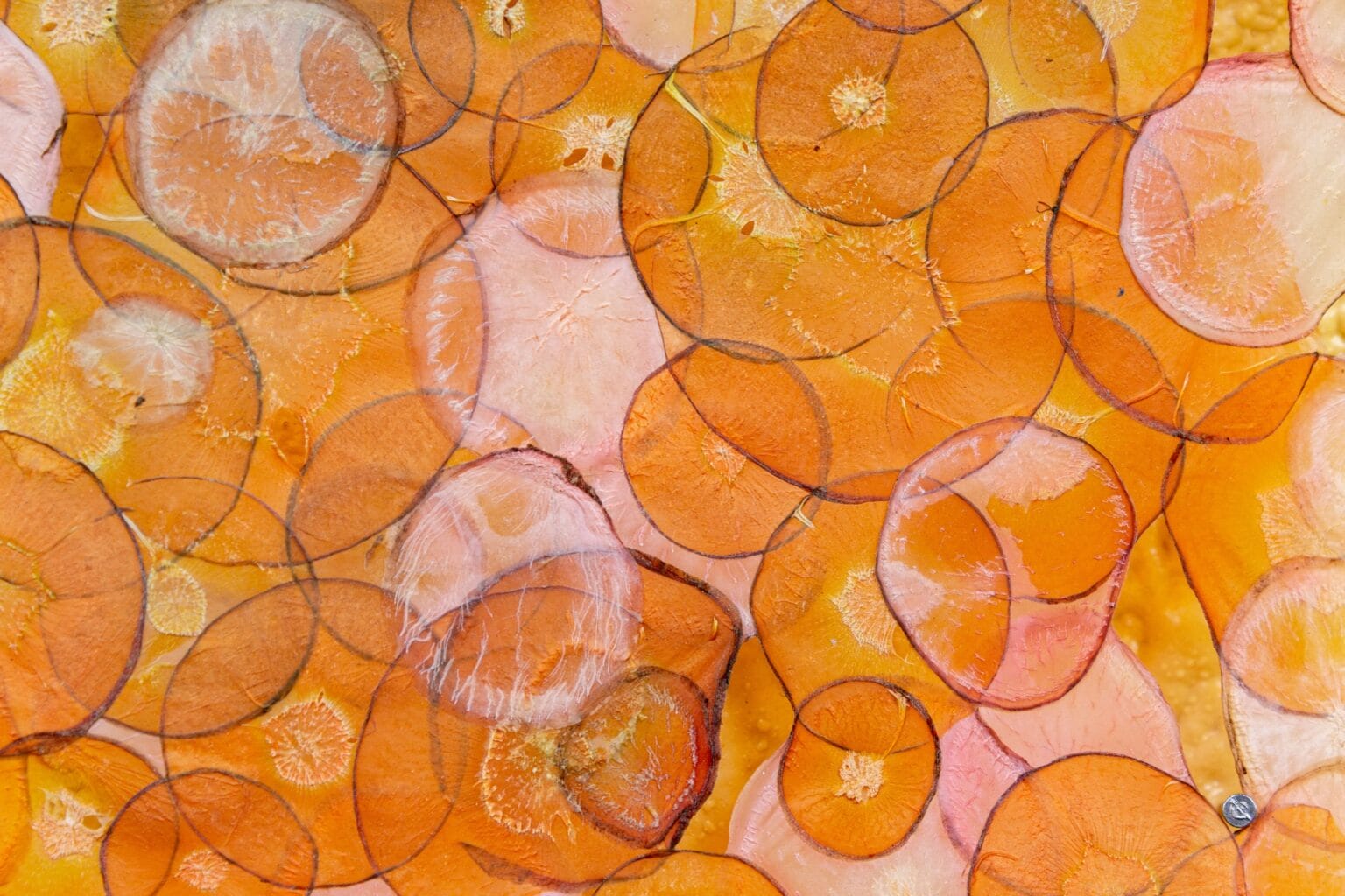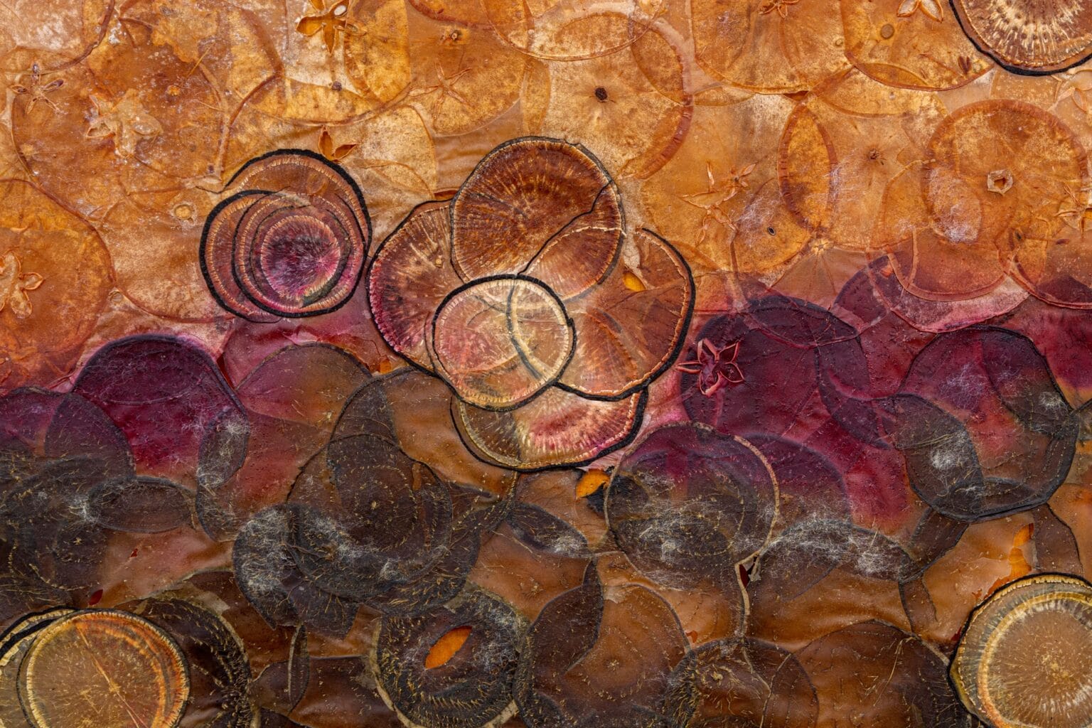 Al igual que las tradiciones ancestrales de tejer papiro, Ruby Jackson crea un sustrato igualmente seco a partir de delicados cortes de frutas y verduras. La artista, radicada en Chatham, Nueva York, corta y deshidrata ingredientes que van desde manzanas y peras hasta daikon morado y sandía, transformándolos en piezas delgadas y translúcidas que luego utiliza para armar collages en distintas formas.