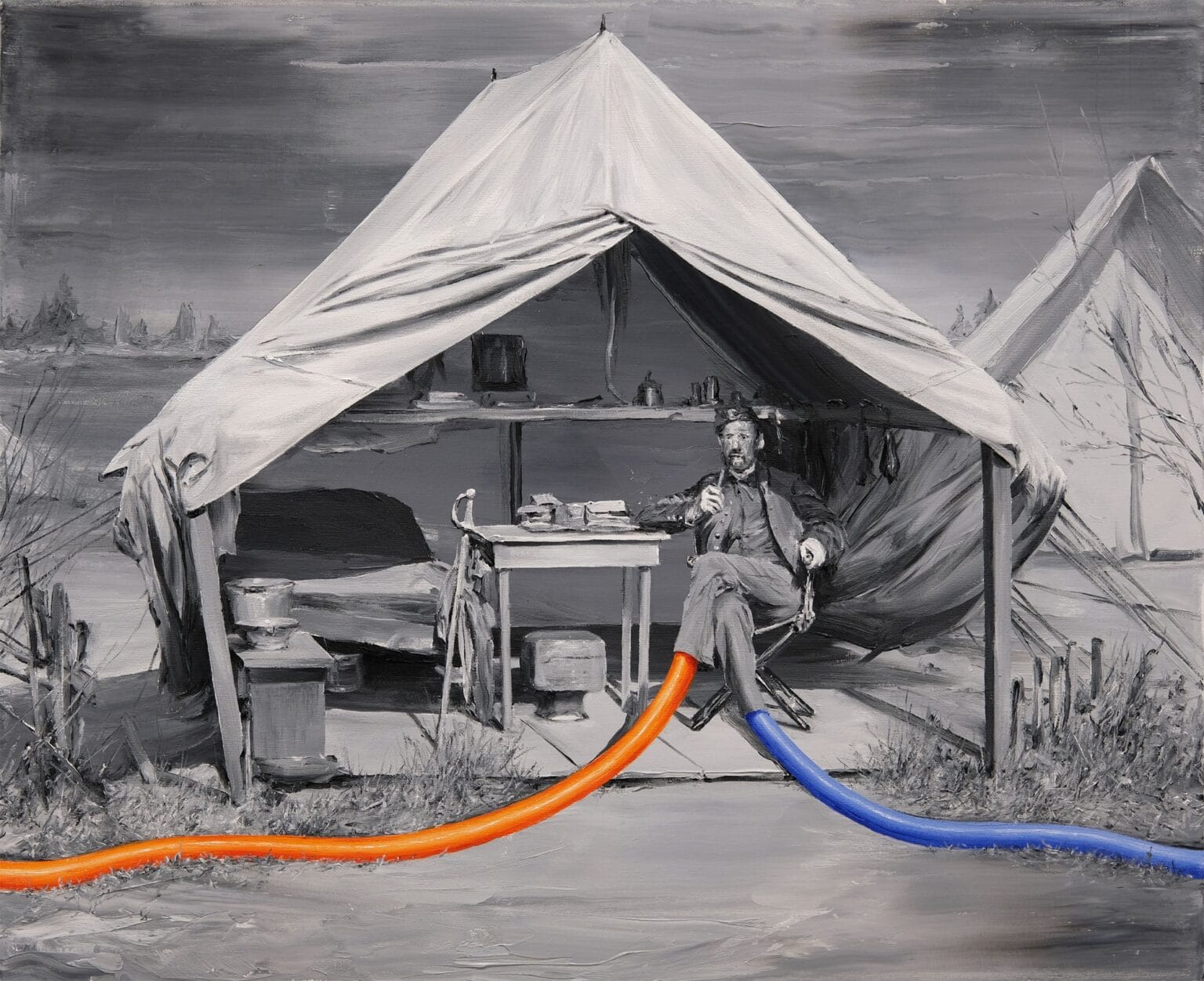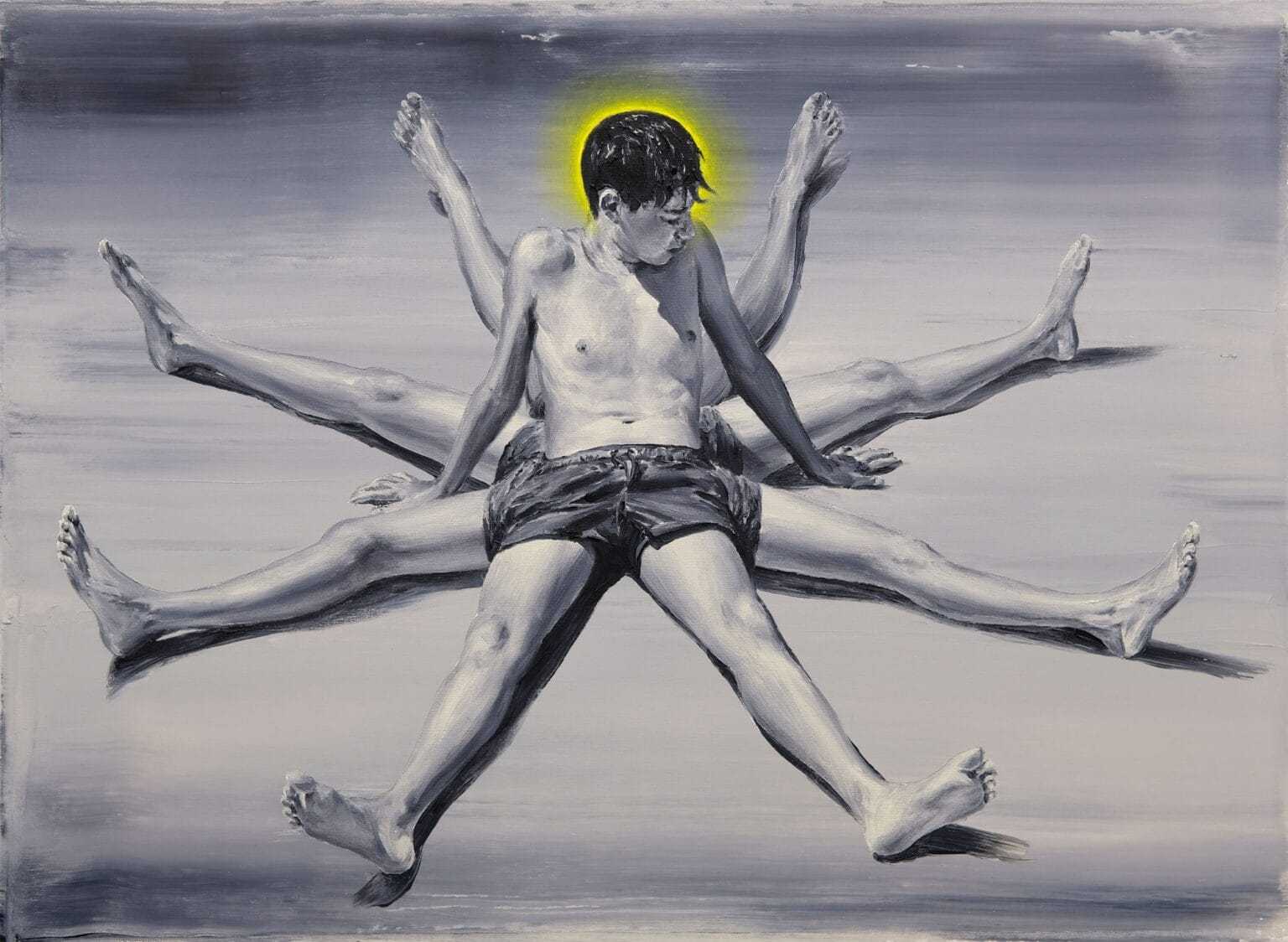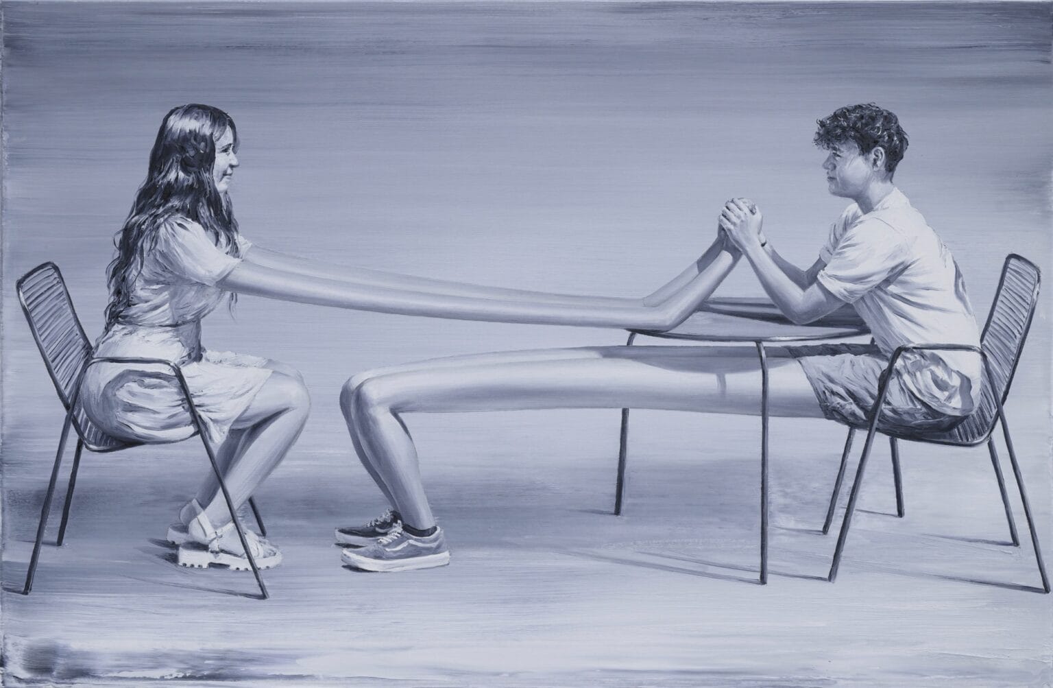 Sus pinturas, casi siempre en escala de grises, parten de fotografías antiguas que podrían pertenecer al álbum familiar de cualquier década olvidada. Pero Pomet las estira —literal y metafóricamente— hasta romper la lógica. Entre trazos clásicos aparecen destellos de color: una extremidad exageradamente elástica, un objeto celeste que flota sin explicación, un detalle que rompe la nostalgia y la convierte en extrañeza.
