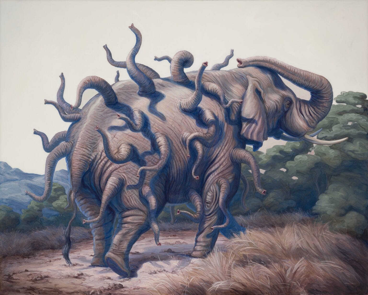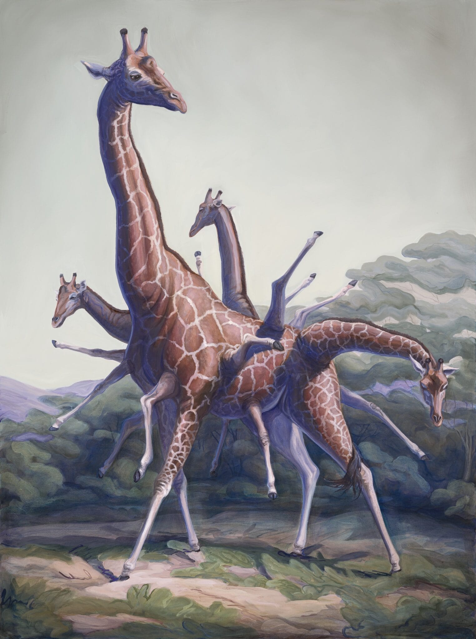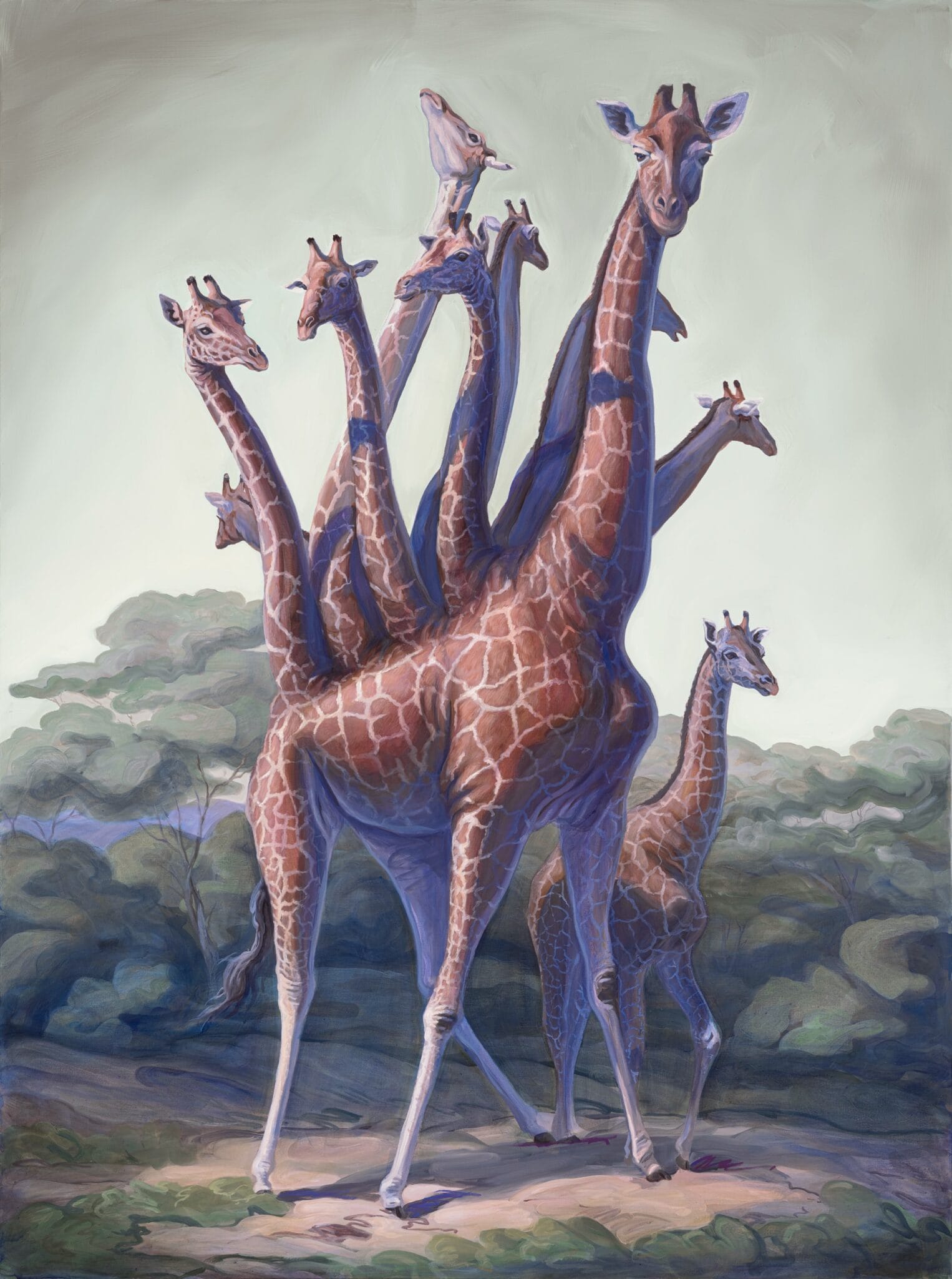 Hay algo inquietante en ver un elefante cubierto de trompas o una jirafa con múltiples cabezas y patas saliendo en todas direcciones. A pesar de los escenarios bucólicos y sus expresiones calmadas o curiosas (como si nada pasara), los cuadros de Pontiroli te dejan con una leve sensación de inquietud. ¿Qué hicimos para que esto existiera? ¿Es un reflejo de nuestras propias contradicciones?