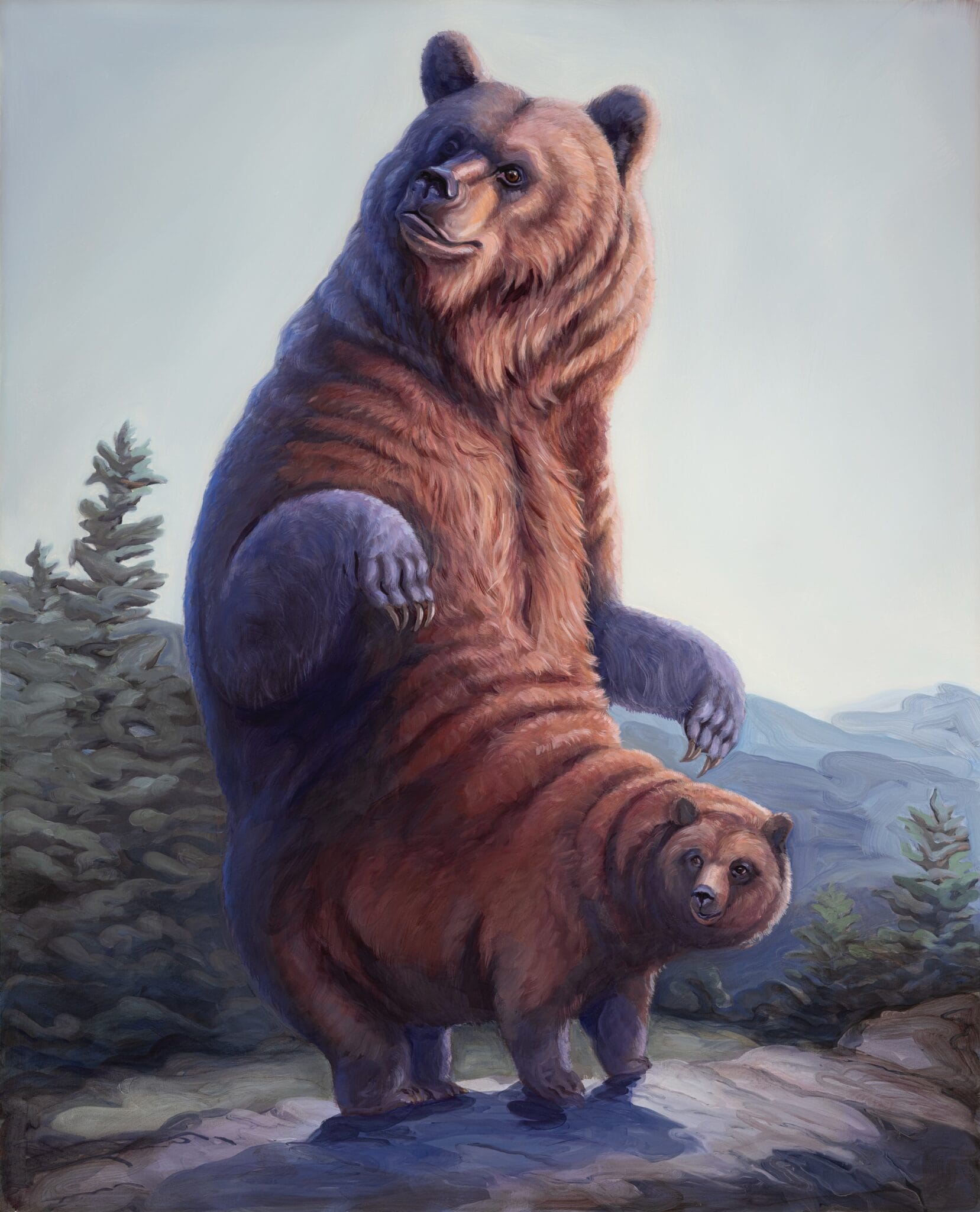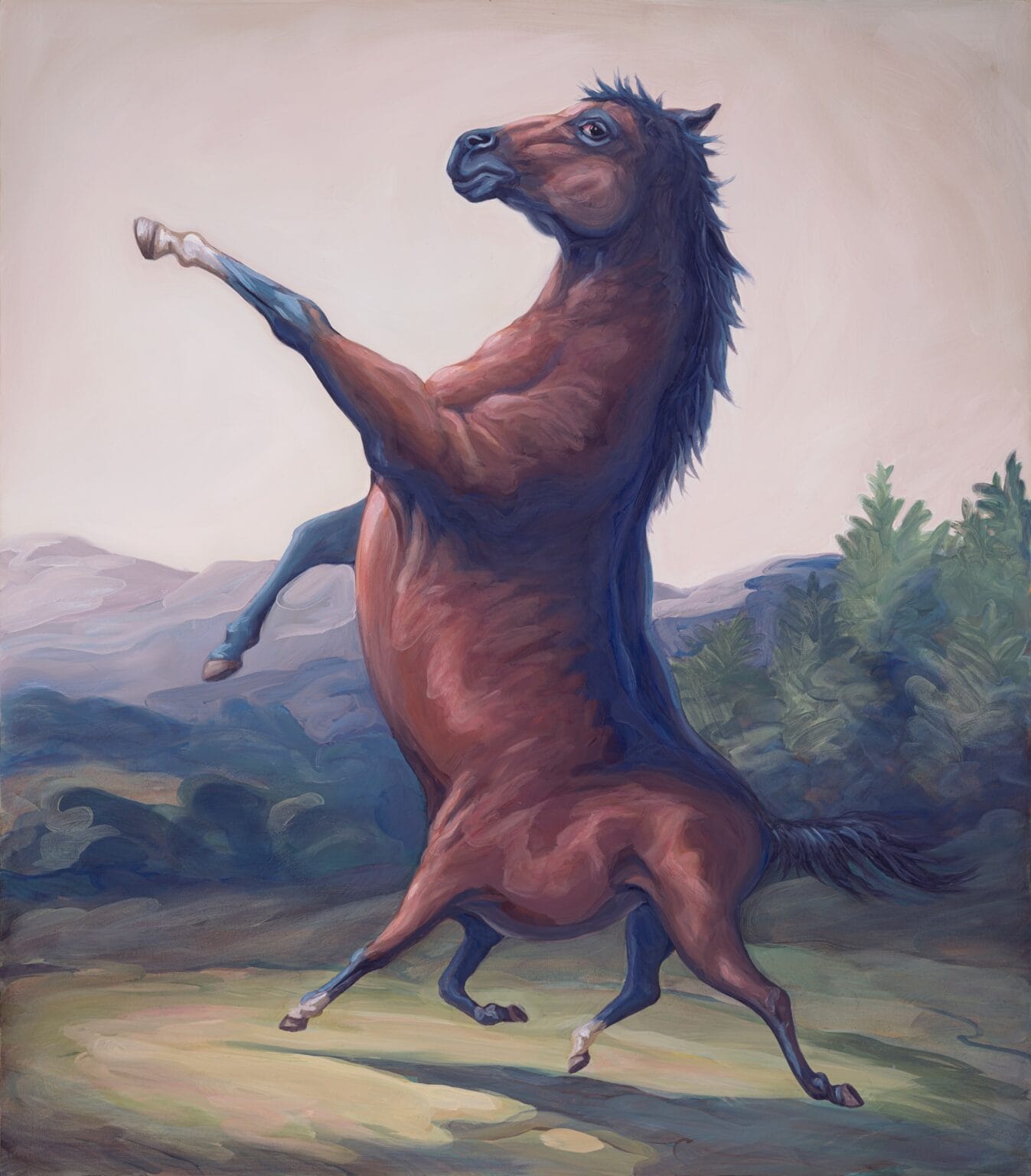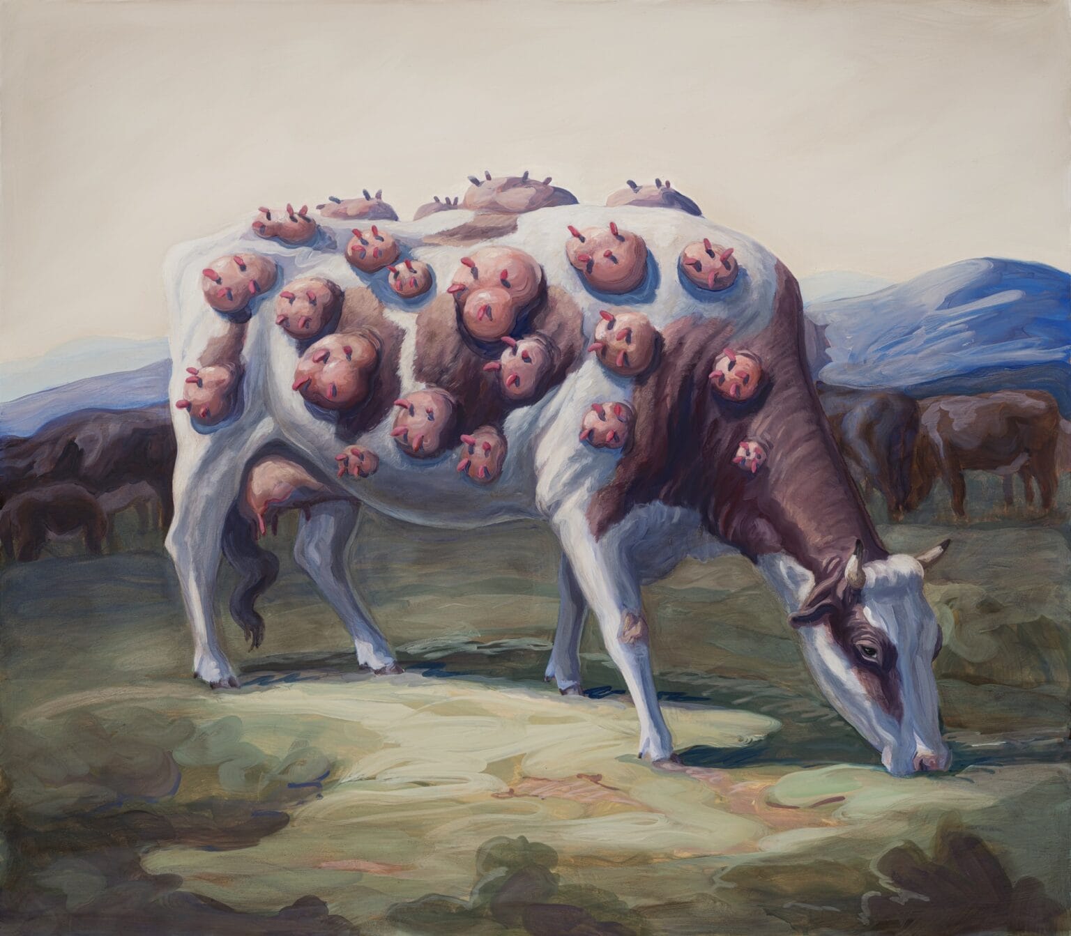 Sus cuadros son pura rareza hermosa: animales con patas eternas, cuerpos retorcidos o cabezas y extremidades mutantes por todos lados. Los ubica en paisajes de bosque o pradera que parecen sacados de pinturas académicas del siglo XVIII o XIX, o de esas escenas de caza elegante. Ahí están los animales —domésticos o salvajes— pastando tranquilos, como si tener doce cabezas o ubres en lugares imposibles fuera lo más normal del mundo.