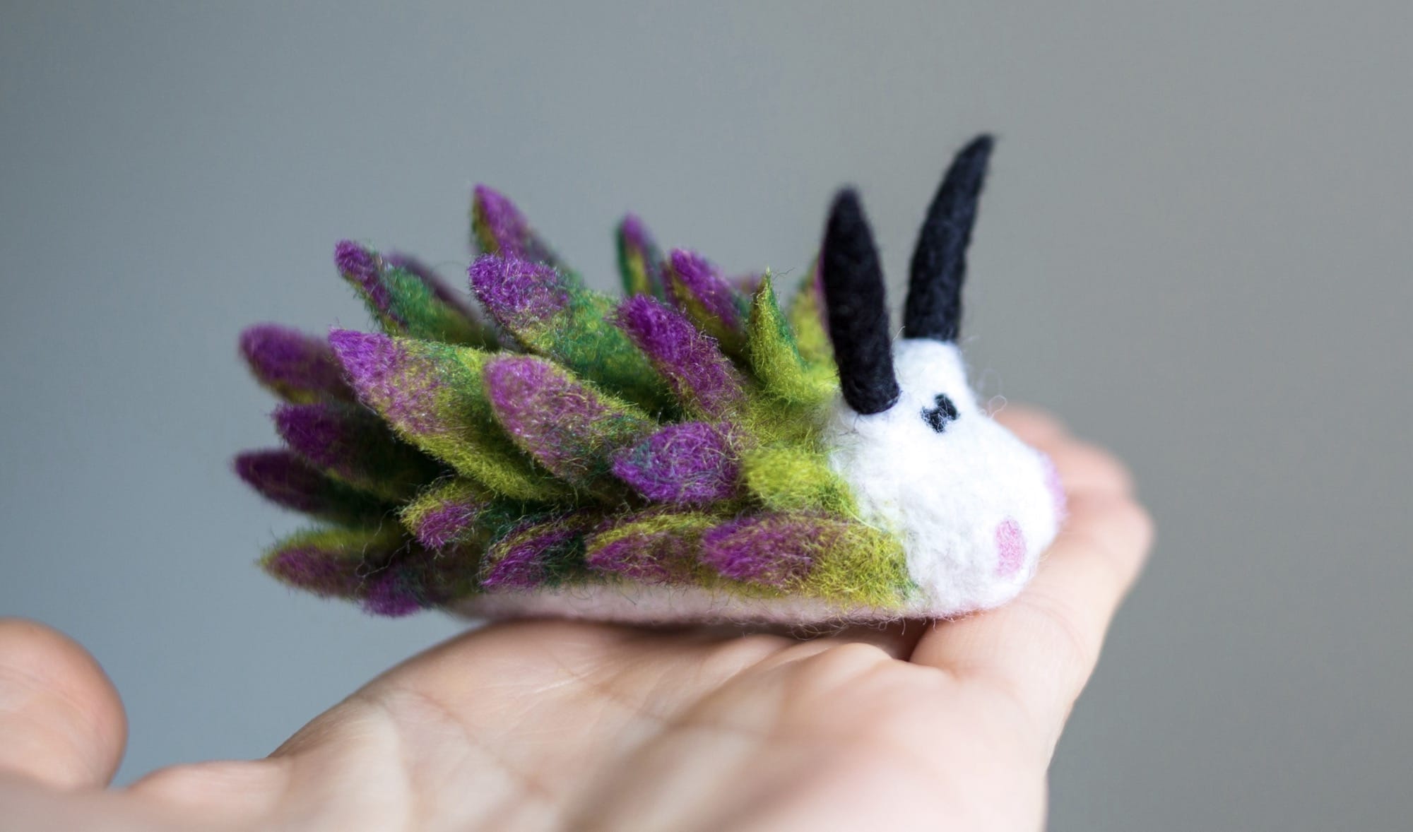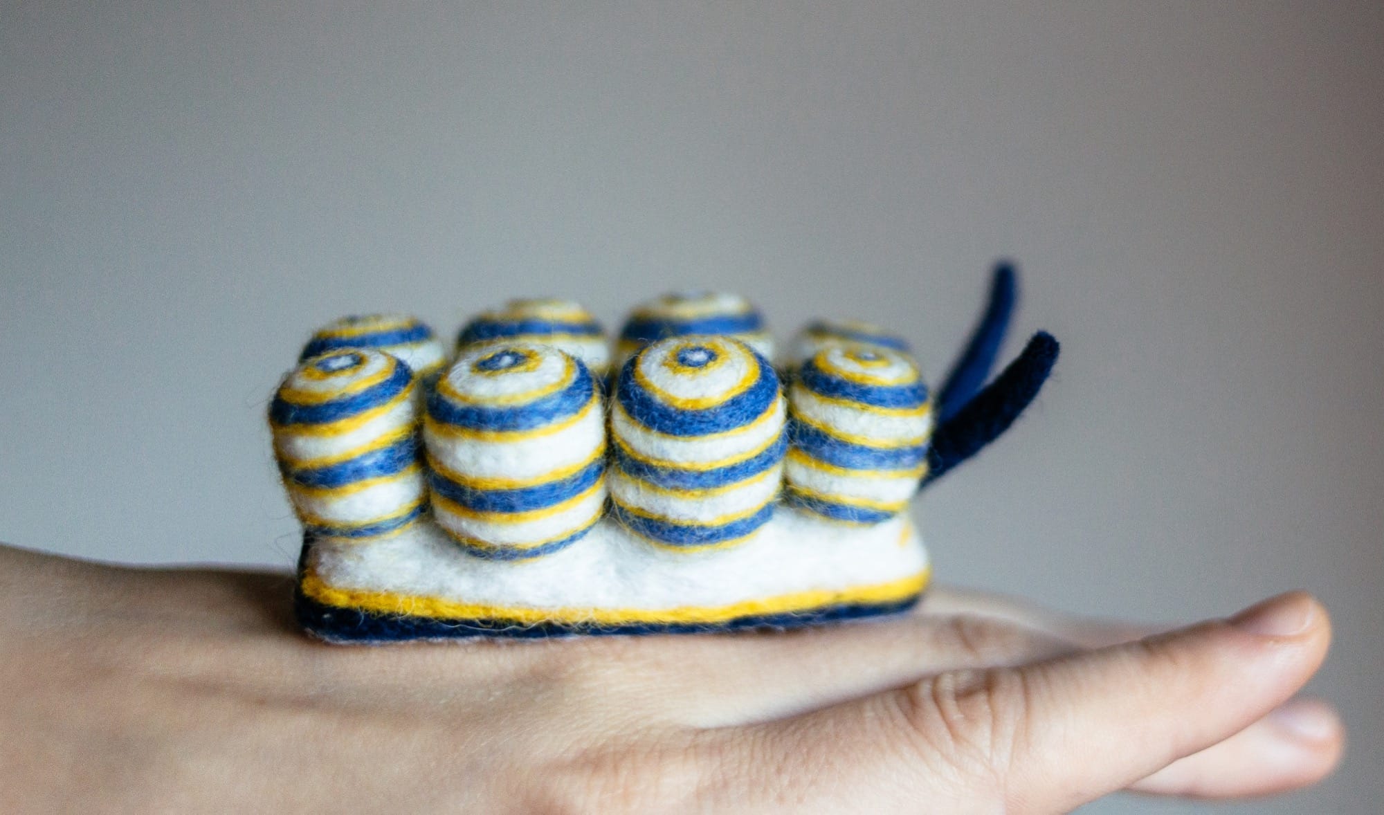 Para la artista Arina Borevich de Wool Creature Lab, estos seres diminutos brillan de verdad en fibra fieltrada. Hace una década trabajaba como cocinera en una estación de investigación biológica remota en el Mar Blanco, norte de Rusia. “Estaba rodeada de 200 biólogos marinos y estudiantes en una pequeña isla”, cuenta. “Ese verano lo cambió todo. Fue ahí donde descubrí los nudibranquios: babosas de mar imposibles de color, con formas y patrones que parecen de otro planeta”.